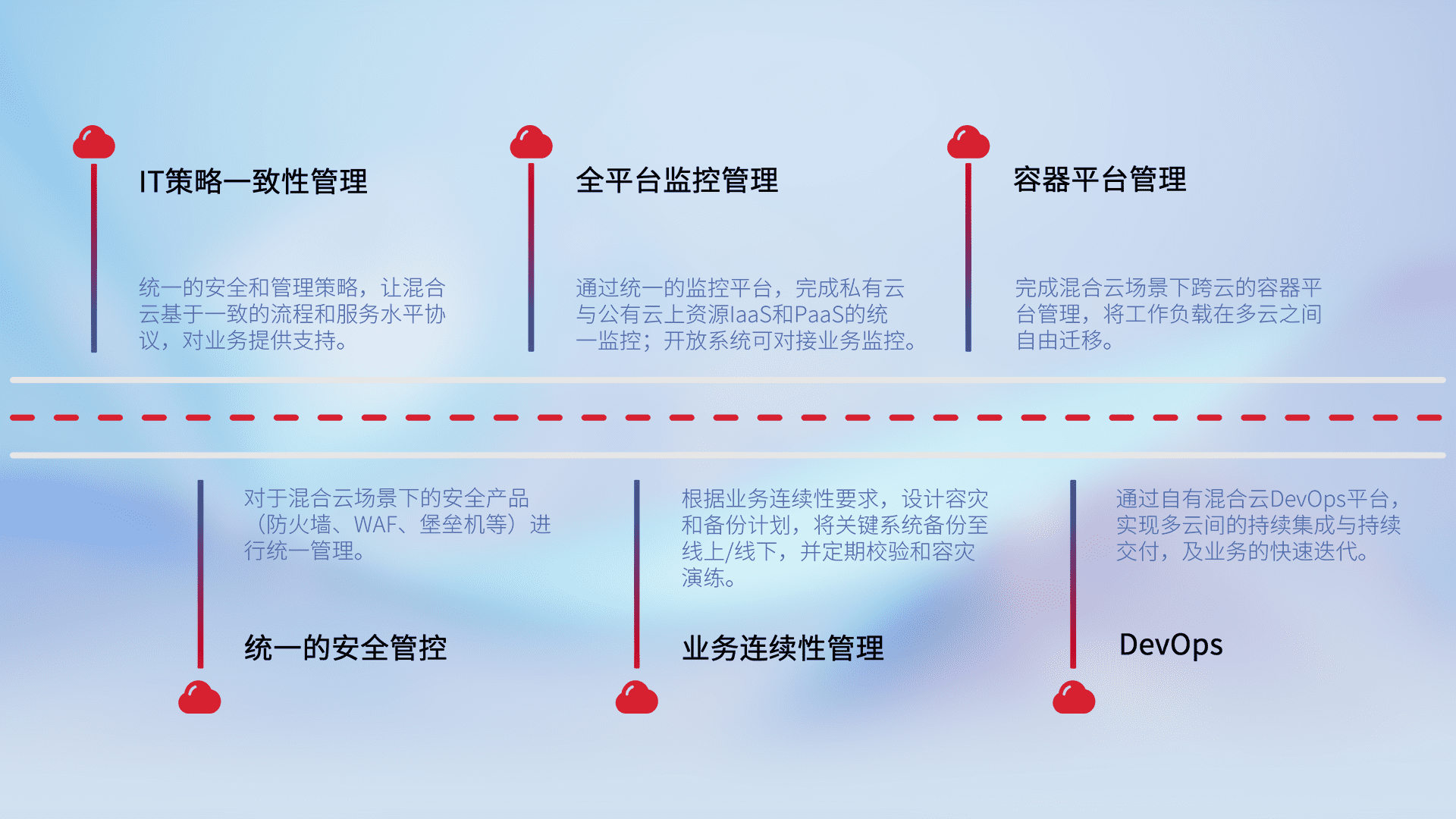 通过多云纳管,,,以统一的资源数据模型把客户的云资源进行抽象和封装,,进而实现对多云资源的统一操作,,,保障云资源管理的可靠性、、稳定性与可用性。。量身定制化运维内容,,配置、、、开发运维、、、、补丁管理、、、备份、、、、监控、、、、认证和访问管理、、、审计和日常巡检等,,保障在用云过程中的可靠度,,,稳定度以及高可用率。。。。