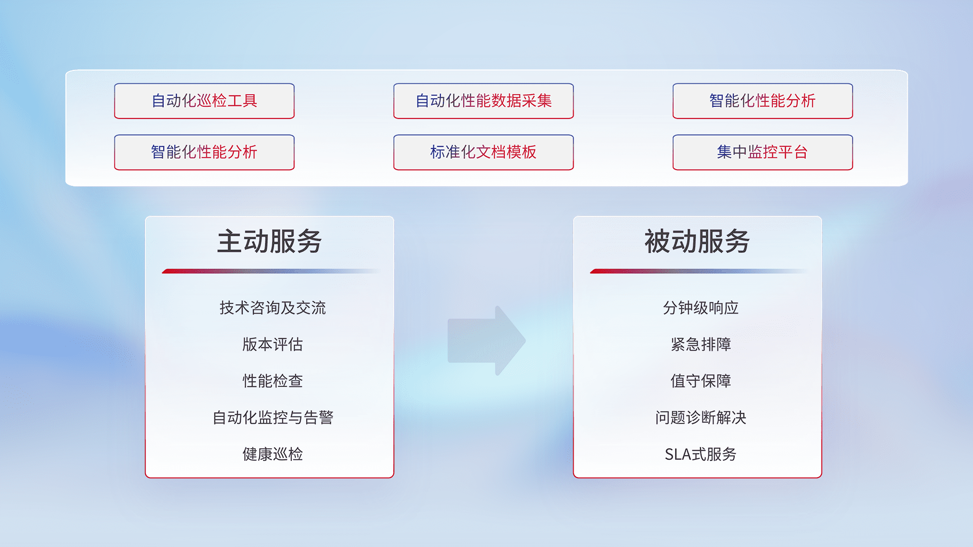 智能化工具和标准化文档,,保障服务质量,,,,提供主动服务(包含技术咨询、、、、版本评估、、、、性能检查、、、自动化监控与告警、、、健康巡检)和被动服务包含(分钟级响应、、、、紧急排障、、值守保障、、、、问题诊断解决、、SLA服务)。。。。